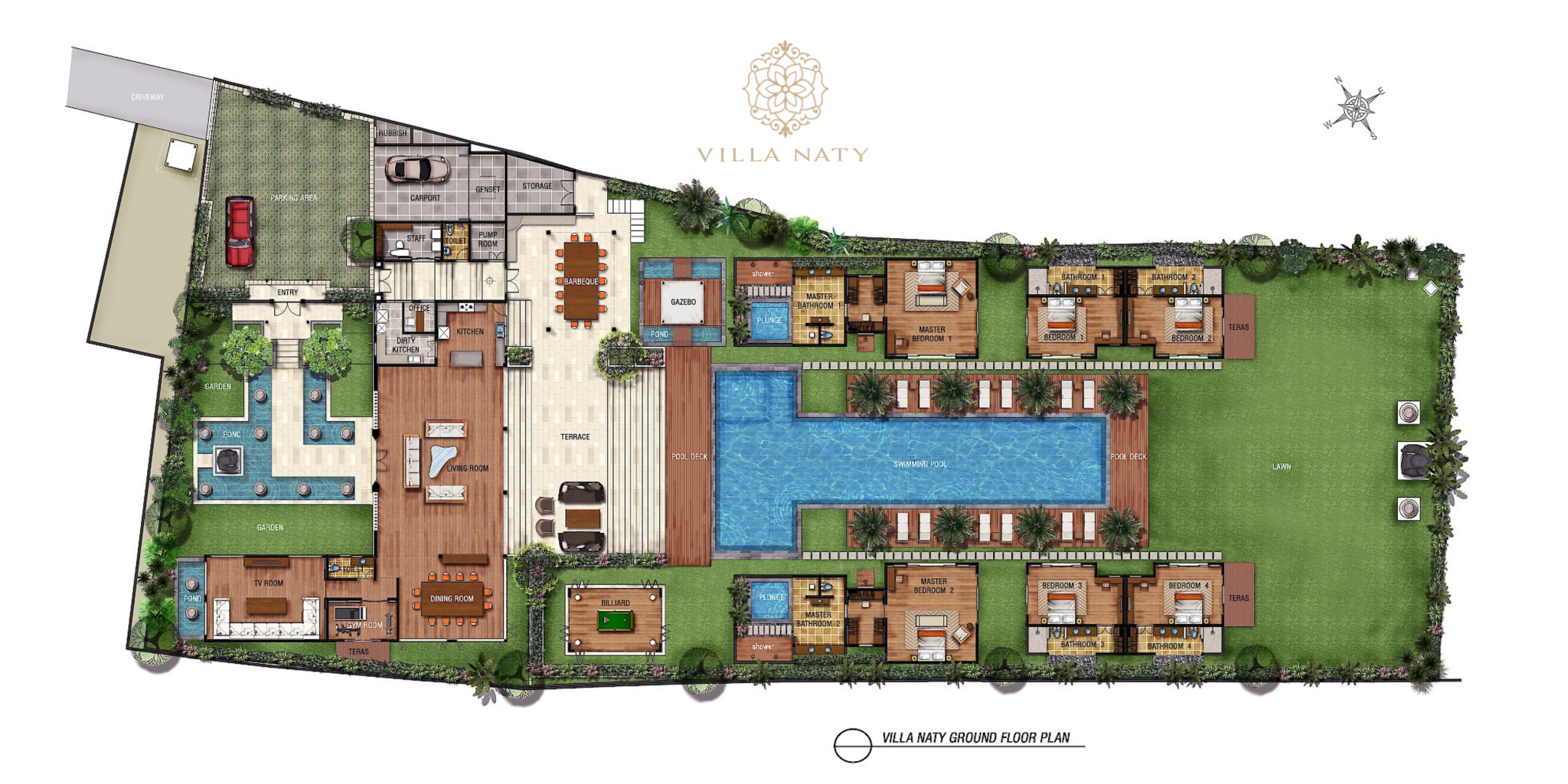 Living Areas | Spacious living room with stereo equipment, Dining, TV/media room, Gym (AC), Fully-equipped kitchen, Powder room, BBQ pavilion, Wooden deck with Sunbeds, Outdoor Massage Gazebo, Billiard room. |